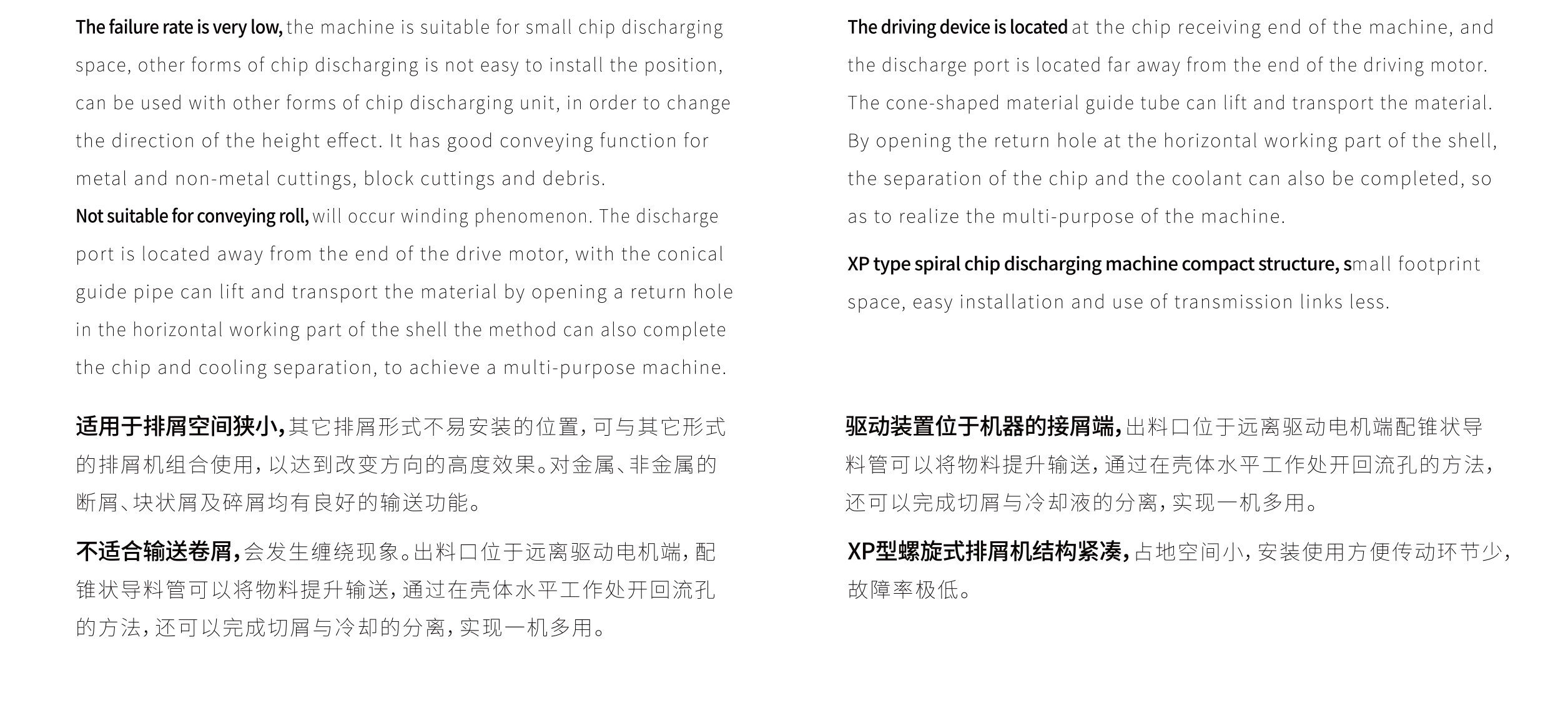 適用于排屑空間狹小,其它排屑形式不易安裝的位置,可與其它形式的排屑機組合使用,以達到改變方向的高度效果。對金屬、非金屬的斷屑、塊狀屑及碎屑均有良好的輸送功能。