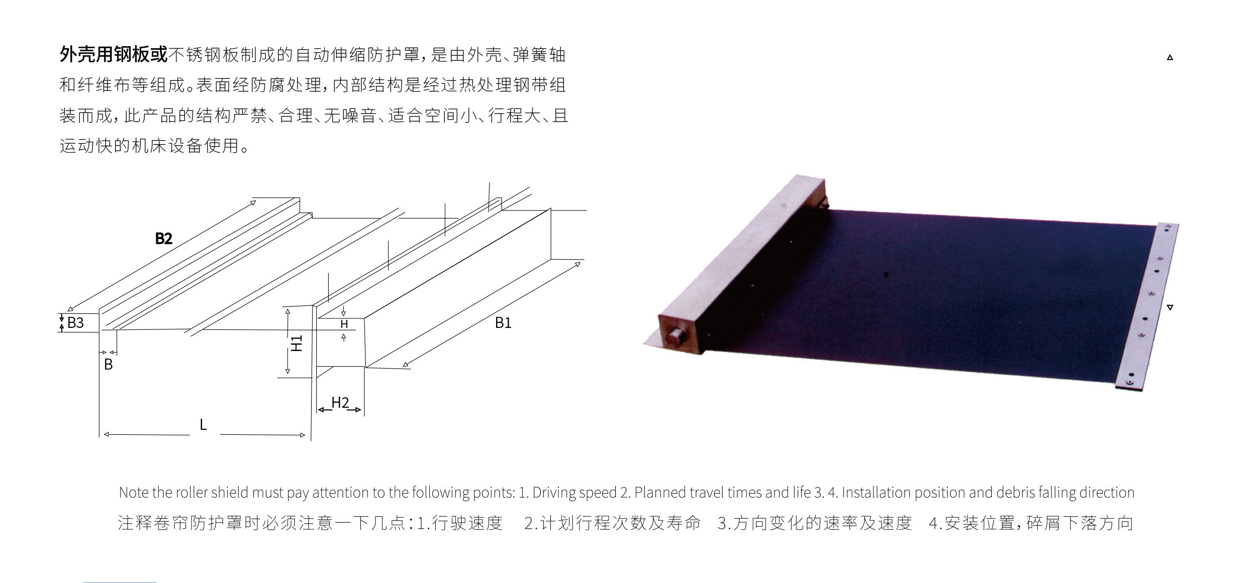 外殼用鋼板或不銹鋼板制成的自動伸縮防護罩,是由外殼、彈簧軸 和纖維布等組成。表面經(jīng)防腐處理,內(nèi)部結(jié)構(gòu)是經(jīng)過熱處理鋼帶組 裝而成,此產(chǎn)品的結(jié)構(gòu)嚴(yán)禁、合理、無噪音、適合空間小、行程大、且運動快的機床設(shè)備使用。
